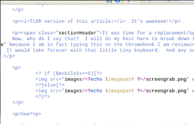 There are a few steps involved in writing a new article for this site. It basically involves copying the template, setting a few variables, and getting the new files up to the server. All of which were done with this machine the same as any other laptop I normally use. No problems at all. Even that screen grab with a resize and crop would have been too arduous a process on a tablet. It went pretty smoothly here.