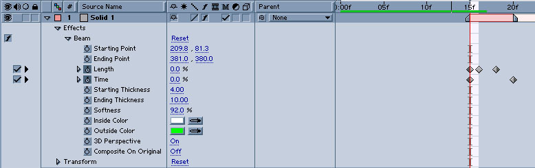 At this point it makes the most sense close the Effects dialog, and work in the timeline. Uncollapse the beam layer by clicking the little arrow on the left. Then keep uncollapsing until you get the Beam effect open. Make sure your playhead is still at frame 15 (the beginning of this layer). Click on the little stop watch to turn on a key frame, set the value for Time to 0% - subsequent keyframes will be added automatically. Then move the playhead up 4 frame and change the value for Time to 100%.