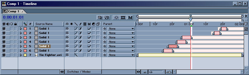 In the video I made with this tutorial I had the Tie fire 6 shots. 4 in rapid succession in the beginning and 2 at the end. The first 4 shots are separated by 3 frames. Then there is a delay, then at 1;15 the last 2 shots come in. The last 2 shots are only 2 frames long and they are thicker than the first set. (The fighter is closer to the camera.) And this is what the final timeline looks like: