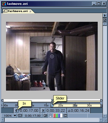 The first thing to do now is find the IN point for the clip. In this case, it's at 17 seconds in. The first 16;29 seconds were either bad takes or me walking around... Whatever... For those of you using the example clip, you'll see the first 16 seconds as a black box. Partly to hide the bad takes, but mostly to make the video compress smaller.