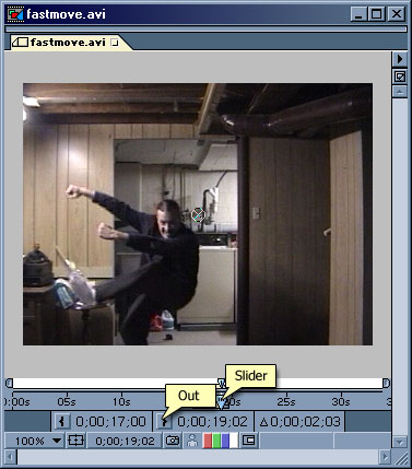 Now you have to mark the OUT spot for the first clip. Double click on the clip to open it, use the slider to scrub through to the last frame before the effect begins. In this case it's at 19;02. Press the OUT button.