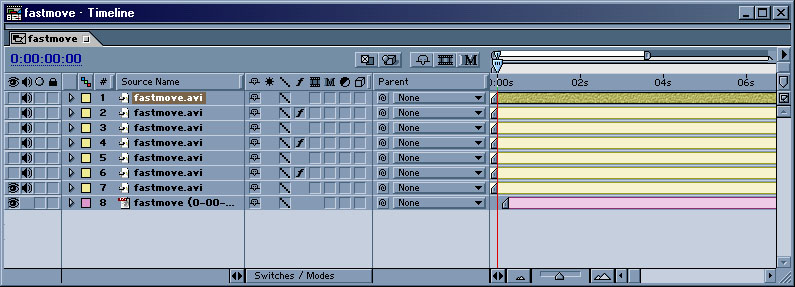 Next, make all those dupes invisible so they don't obscure one another. Click on the little eyeball for the 6 new clips and hide them all. When you're finished, your timeline should look like this: