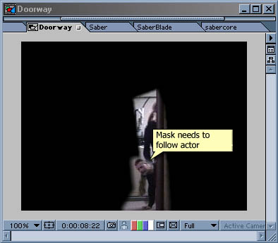 Sometimes it it necessary to animate the mask to follow the actor. In this case I needed to do this because the instance of me on the top right needs to appear behind the instance of me on the bottom right. This happens as that character goes to move out of the doorway. At the same time the character on the bottom begins to move also. So, I needed the mask on the bottom character to follow him out of the doorway.